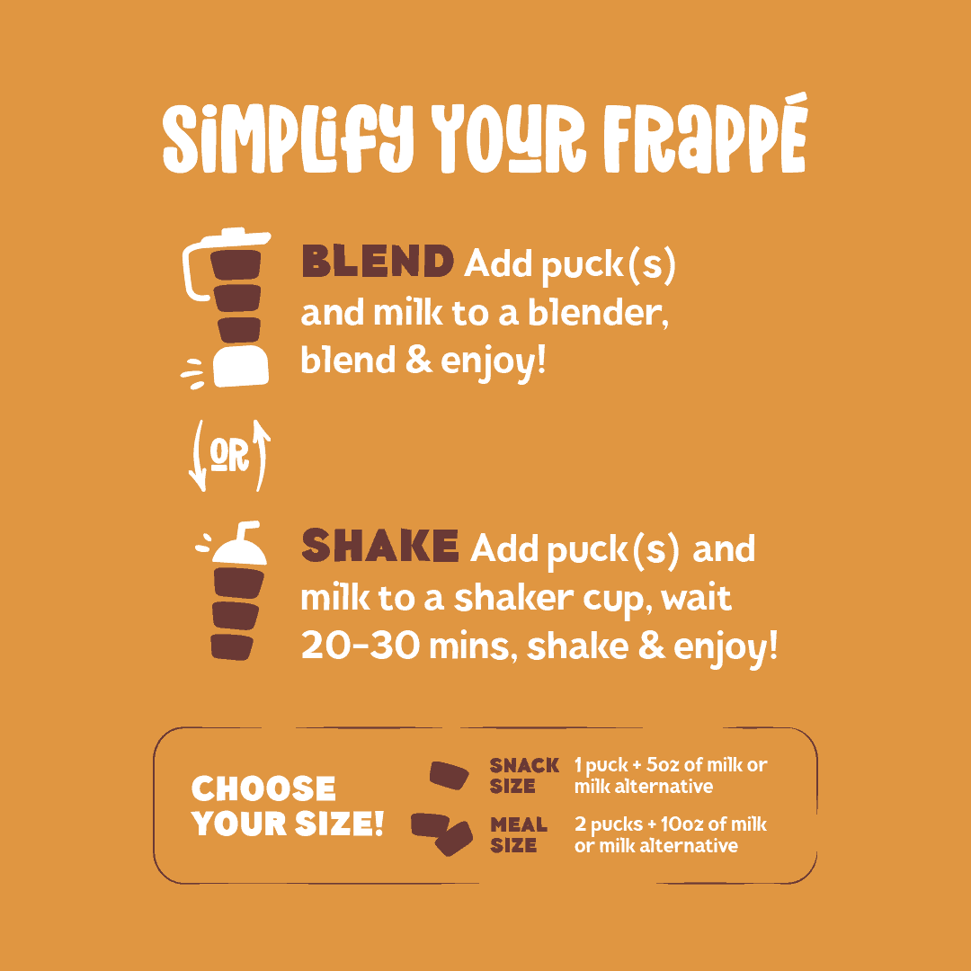 Add puck(s) and milk or milk alternative to a shaker cup, wait 20-30 mins, shake & enjoy!