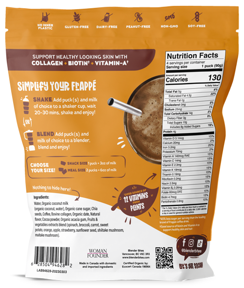 Ingredients: Water, Organic coconut milk (organic coconut, water), Organic cane sugar, Chia seeds, Coffee, Bovine collagen, Organic date, Cocoa powder, Organic acacia gum, Fruits & vegetables extracts blend (spinach, broccoli, carrot, sweet potato, orange, apple, strawberry, sunflower seed, shiitake mushroom, maitake mushroom), Natural flavor.