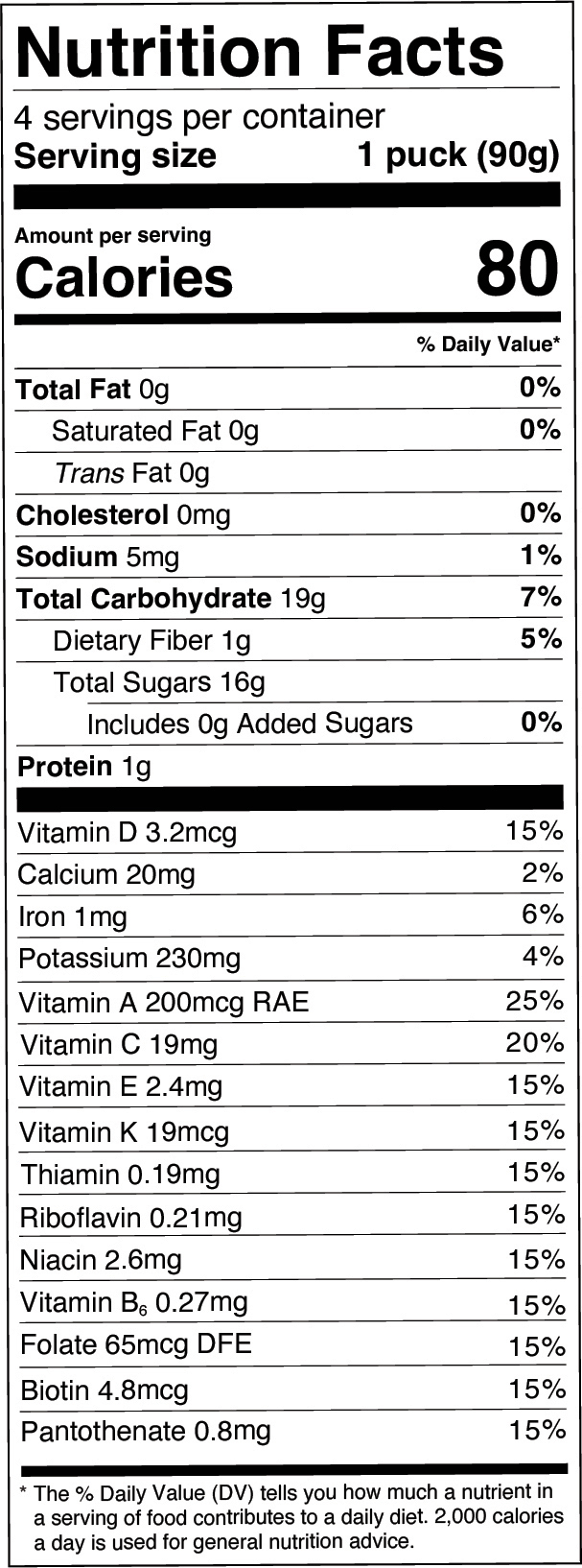 Ingredients: Strawberry*, Cherry*, Apple*, Banana*, Blueberry*, Date*, Filtered water, Lemon juice*, Greens blend* (barley grass, spirulina, wheatgrass, broccoli, chlorella, kale, spinach), Natural flavors*, Plant based vitamins and minerals derived from (spinach, broccoli, carrot, sweet potato, orange, apple, strawberry, sunflower seed, shiitake mushroom, maitake mushroom), Acerola powder*.