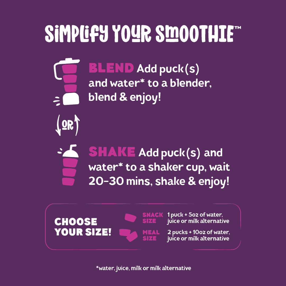 Add puck(s) and water or liquid of choice* to a blender, blend & enjoy!