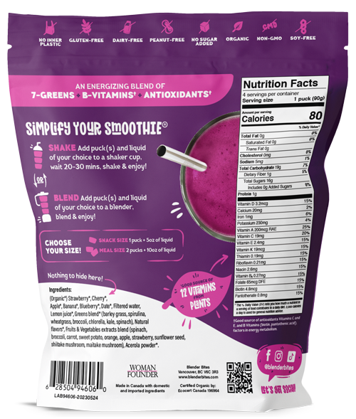 Ingredients: Strawberry*, Cherry*, Apple*, Banana*, Blueberry*, Date*, Filtered water, Lemon juice*, Greens blend* (barley grass, spirulina, wheatgrass, broccoli, chlorella, kale, spinach), Natural flavors*, Plant based vitamins and minerals derived from (spinach, broccoli, carrot, sweet potato, orange, apple, strawberry, sunflower seed, shiitake mushroom, maitake mushroom), Acerola powder*.