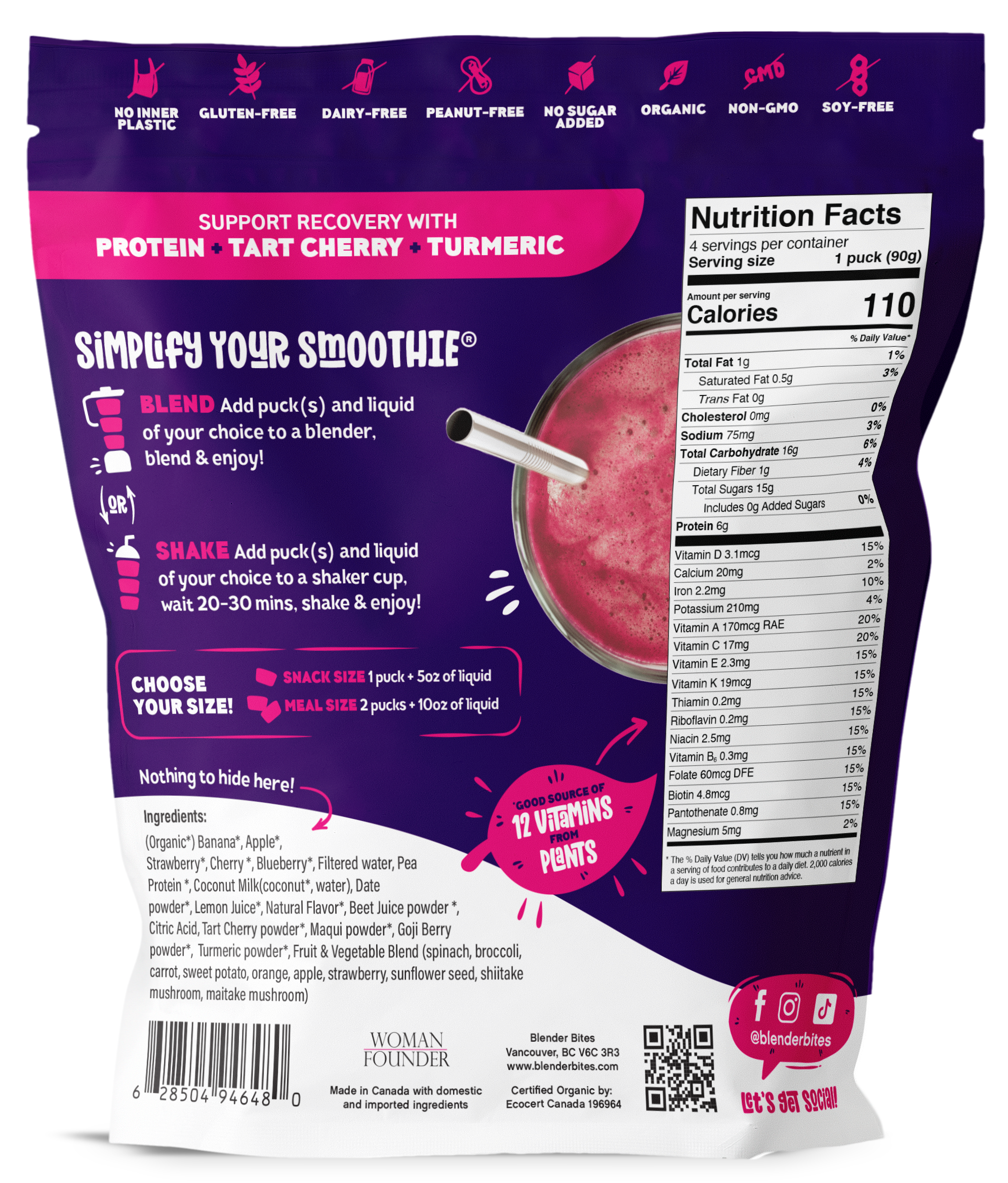 Ingredients: Banana*, Apple*, Strawberry*, Cherry *, Blueberry*, Filtered water, Pea protein *, Coconut milk (coconut*, water), Date powder*, Lemon juice*, Natural flavor*, Beet juice powder *, Citric acid, Tart cherry powder*, Maqui powder*, Goji berry powder*, Turmeric powder*, Fruit & vegetable extract blend (spinach, broccoli, carrot, sweet potato, orange, apple, strawberry, sunflower seed, shiitake mushroom, maitake mushroom)